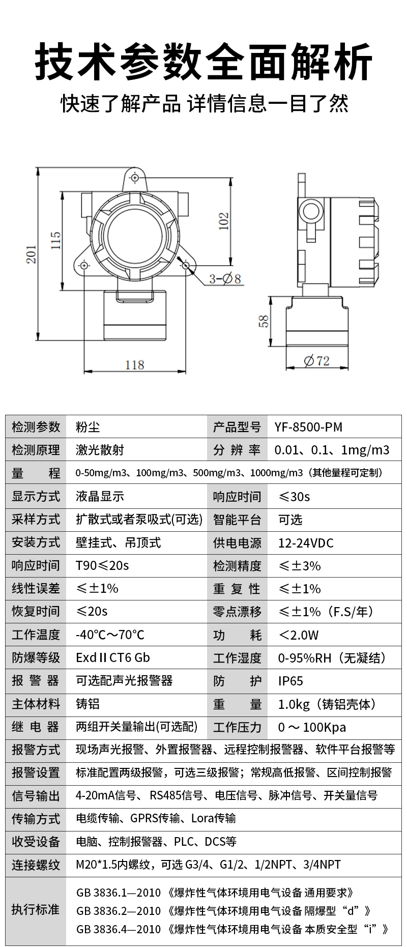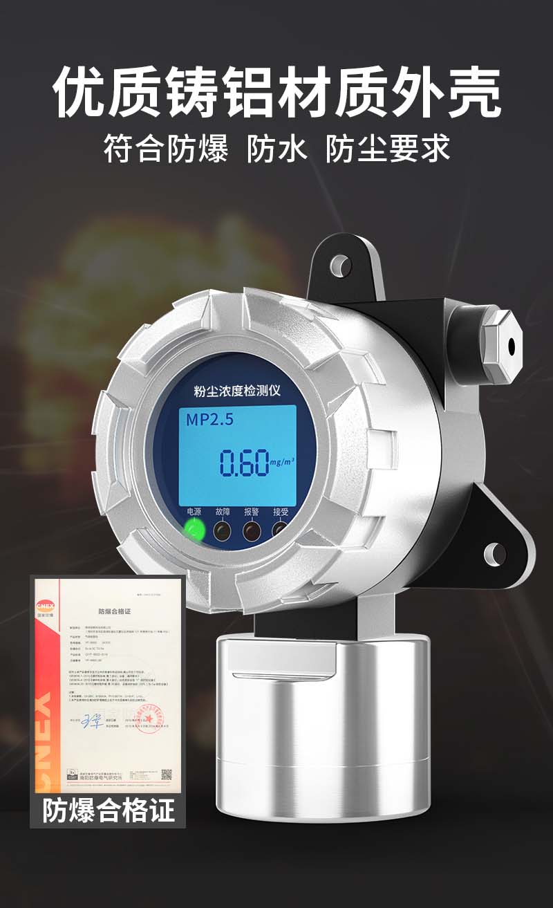 YF-8500-PM奕帆科技YF-8500-PM防爆粉尘浓度检测仪,适用于工厂车间中的粉尘浓度实时准确检测,采用进口激光传感器和微控制器技术,响应速度快,测量精度高,稳定性和重复性好等优点。防爆接线方式活用于各种危险场所,并兼容种控制报警器,PLC,DCS等控制系统,可以同时实现现场报警预警,4-20mA标准信号输出,继由器开关量输出,易示各项技术指标和显示浓度值,同时具有多种极的电路保护功能,有效防止各种人为因素,不可控因素导致的仪器损坏。