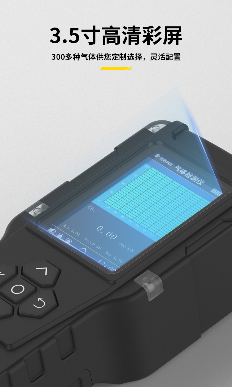 采用泵吸式测量,具备防水,防尘,防震,抗静电,抗电磁干扰,内置水汽、粉尘过滤器,防止因水汽和粉尘损坏传感器和仪器。配置3.5寸高清液晶彩屏实时显示、5000mAH大容量电池超长待机、声光振报警功能。(两种款式可选)