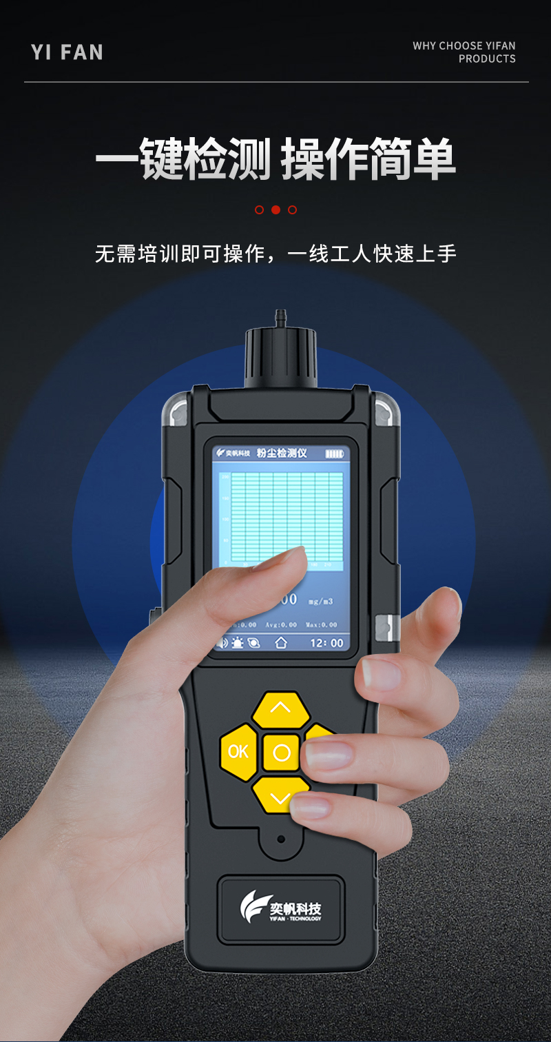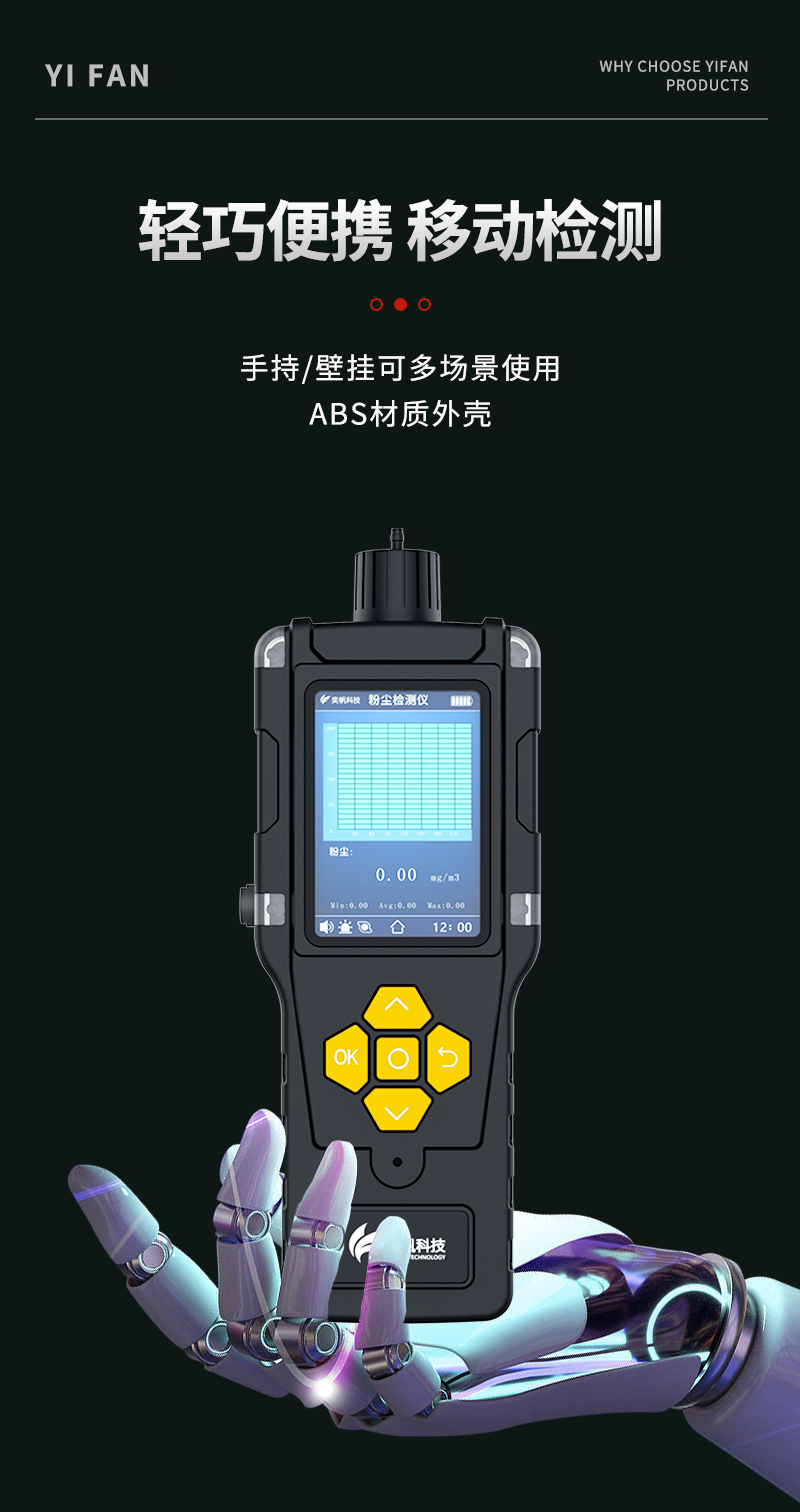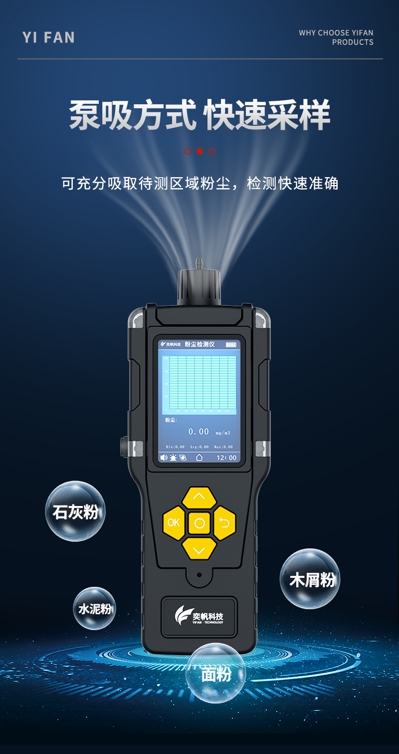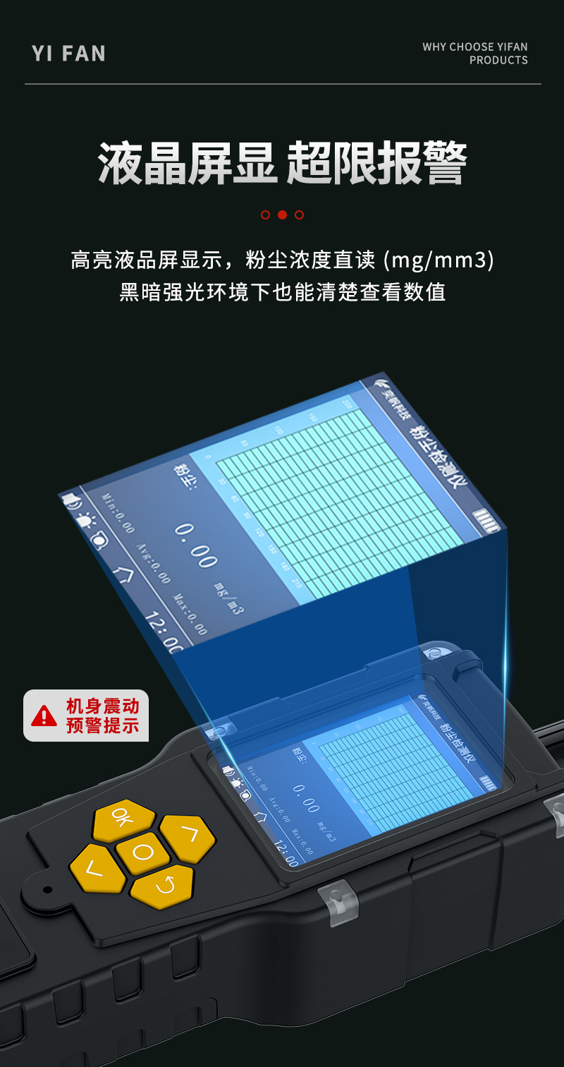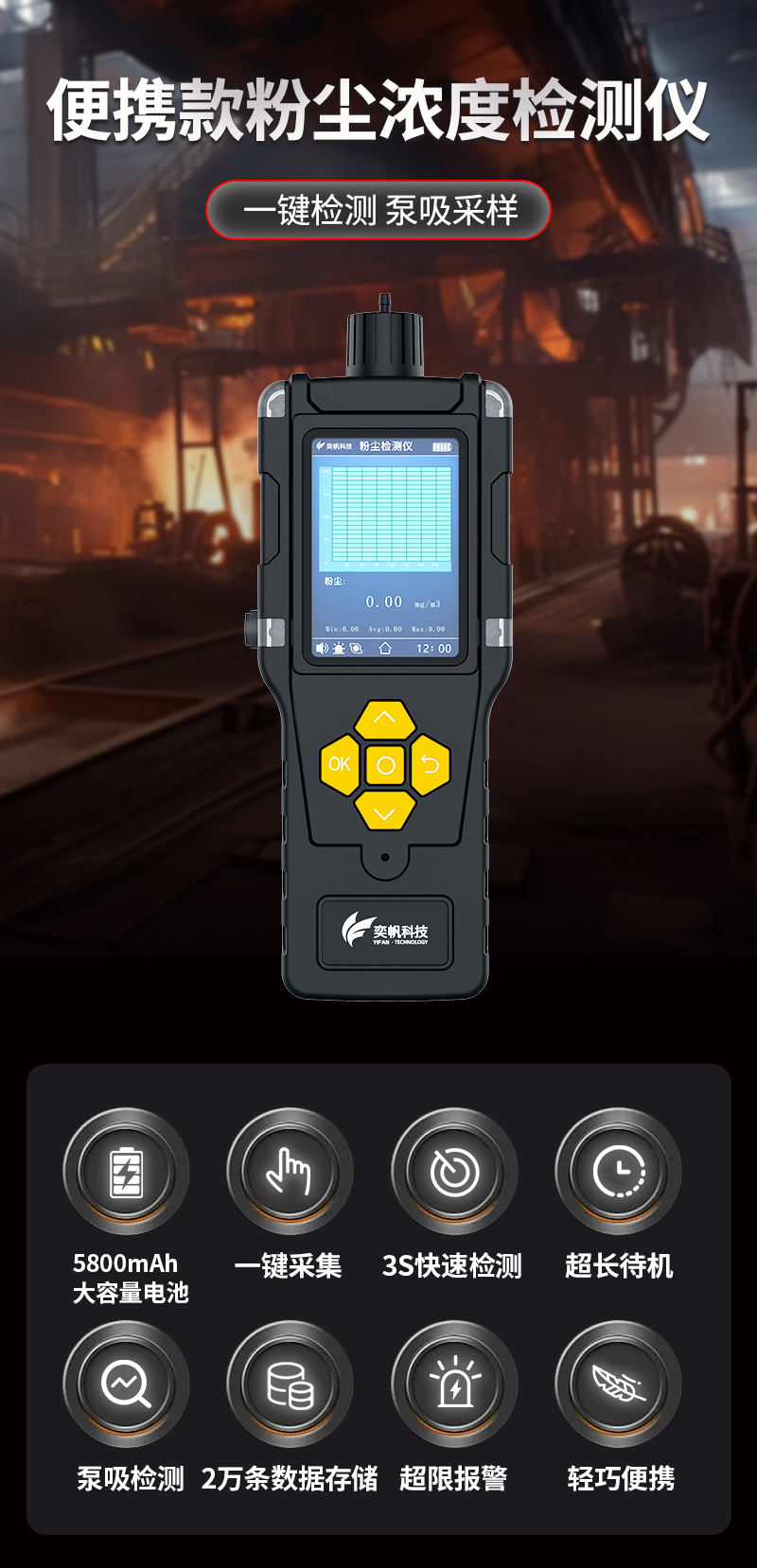 YF-2000-PM奕帆科技泵吸粉尘检测仪,是一款数字化多功能粉尘检测仪,用于工厂车间中粉尘颗粒物(TSP)浓度检测及超标报警。它具有实时数据监测和气体温湿度监测,一段时间内的最大值、最小值、平均值数据,能存储一百万条历史数据,可以连接蓝牙打印机,支持屏幕截图,连接电脑导出图片,提示下次校准倒计时功能等功能。