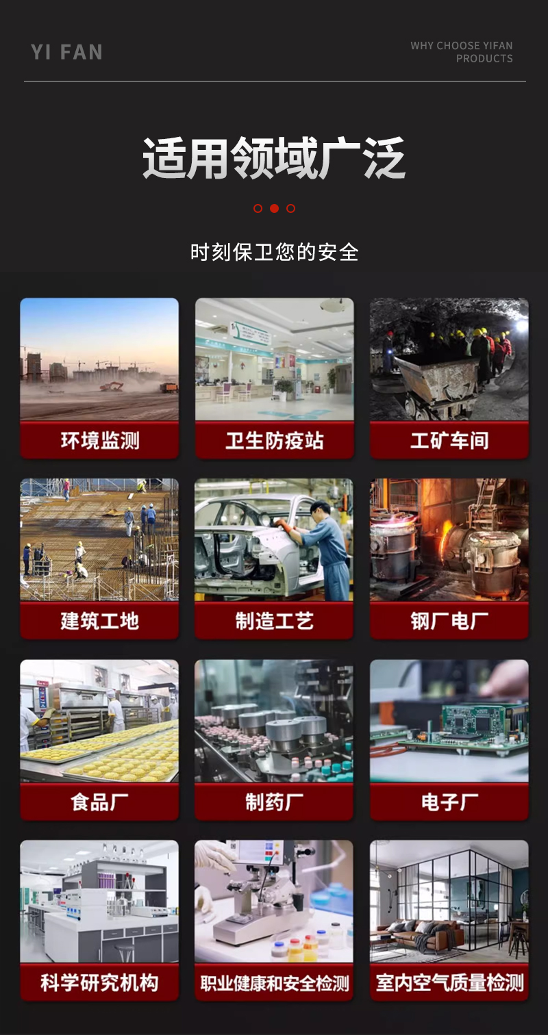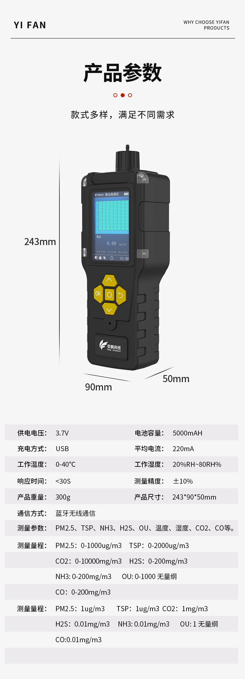 采用泵吸式测量,具备防水,防尘,防震,抗静电,抗电磁干扰,内置水汽、粉尘过滤器,防止因水汽和粉尘损坏传感器和仪器。配置3.5寸高清液晶彩屏实时显示、5000mAH大容量电池超长待机、声光振报警功能。(两种款式可选)