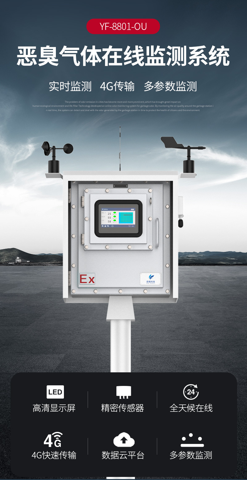 YF-8801-0UYF-8801-0U奕帆科技恶臭在线监测系统,是我公司生产的第二代新型恶臭多参数监测系统,主要监测硫化氢、氨气、三甲胺、甲硫醚、甲硫醇、二甲二硫醚、二硫化碳、苯乙烯等恶臭气体。产品采用高灵敏度传感器技术,可实时监测化工、垃圾、污水、制药、印刷、能源、养殖等引发恶臭物质及有害物质场所的臭气浓度,恶臭监测系统还可配备风速风向等追踪装置,能有效协助环保单位追溯恶臭源头可在app和云平台查看实时数据、历史数据、导出数据等,同时具备24小时连续监测、超标报警、数据存储功能。产品已获得CMA检测报告。