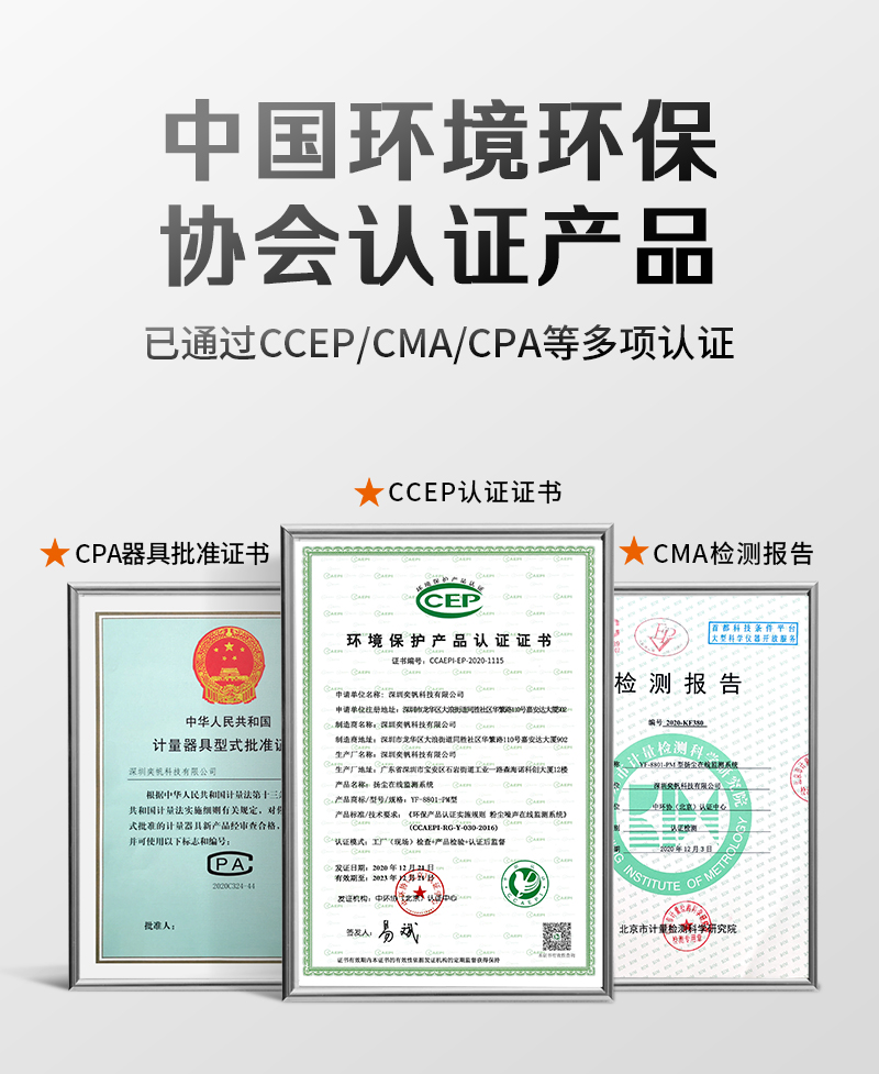 产品资质齐全,有CCEP环保协会认证、有计量院CMA检测报告 -