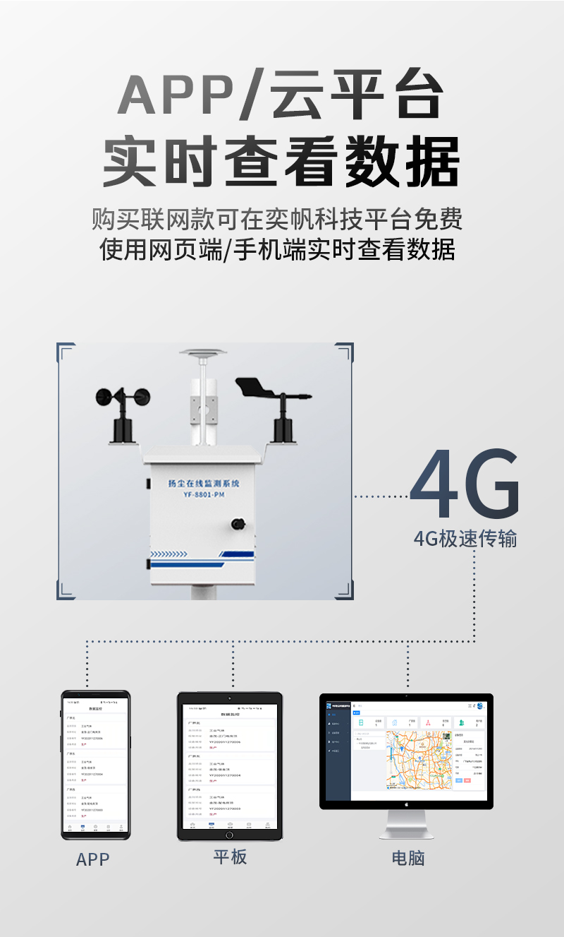 YF-8500-TSPTSP质量监测系统由各类环境传感器、数据采集主控、无线通讯设备、供电设备、软件平台组成。可用于测量 PM2.5、PM10、TSP 等各类环境空气数据。系统采用模块化设计,可根据不同地域环境状况,对环境各要素灵活增加或减少相应的模块和传感器,任意组合,方便快捷的满足各种用户需求。数据通过无线/GPRS上传至云管理平台,运用大数据智能动态分析、及时报警、精准锁源,强化监管体系。