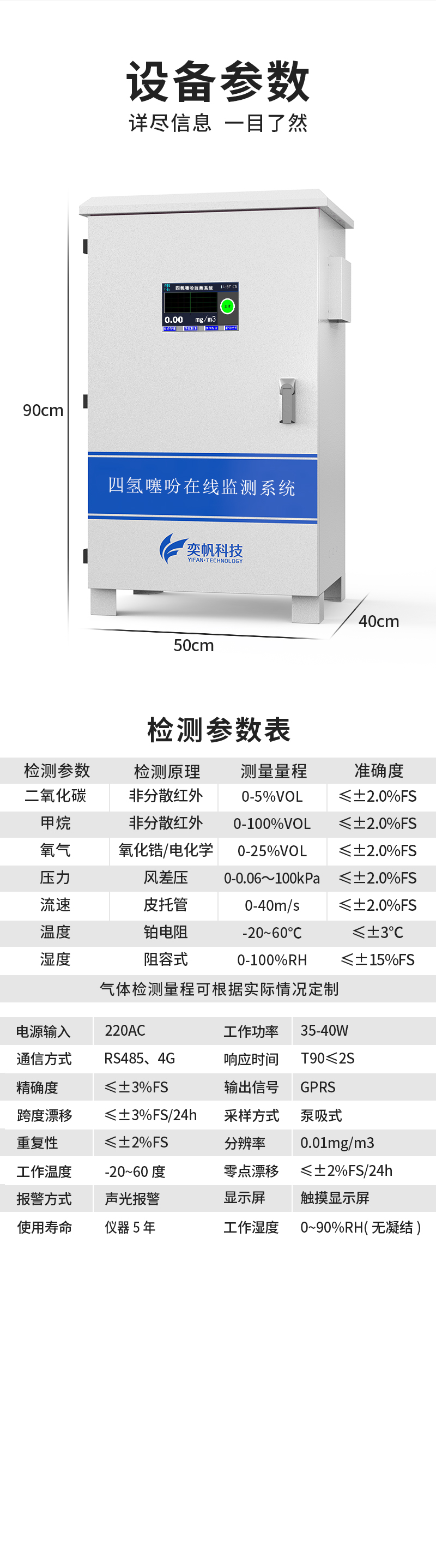 YF-8801-C4H8S奕帆科技四氢噻吩气体在线监测系统,适用于连续监测无组织环境空气中的非甲烷总烃、苯、甲苯、二甲苯等挥发性有机物气体。产品选用进口原装(baseline)高精度PID光离子传感器,采用泵吸式采样监测,内置多重预处系统,包括除尘冷却除水过滤等,可以很好的保护传感器不受侵害,保证监测数据的准确稳定。可在app和云平台查看实时数据、历史数据、导出数据等同时具备24小时连续监测、超标报警、数据存储功能。产品已获得CCEP中国环境环保协会认证、CMA检测报告:软件著作权登记证书。