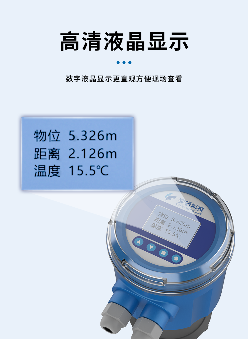 YF-YWQP-V1奕帆科技 系列超声波液位 /物位计采用超声波脉冲原理进行非接触式的测量,是一种非接触式、高可靠性、高性价比、易安装维护的物位测量仪器。它不必接触介质就能满足大部分物位测量要求,集液位水位测距显示变送等功能于一体,被测介质几乎不受限制,可广泛应用于各种液体和固体物料高度的测量。