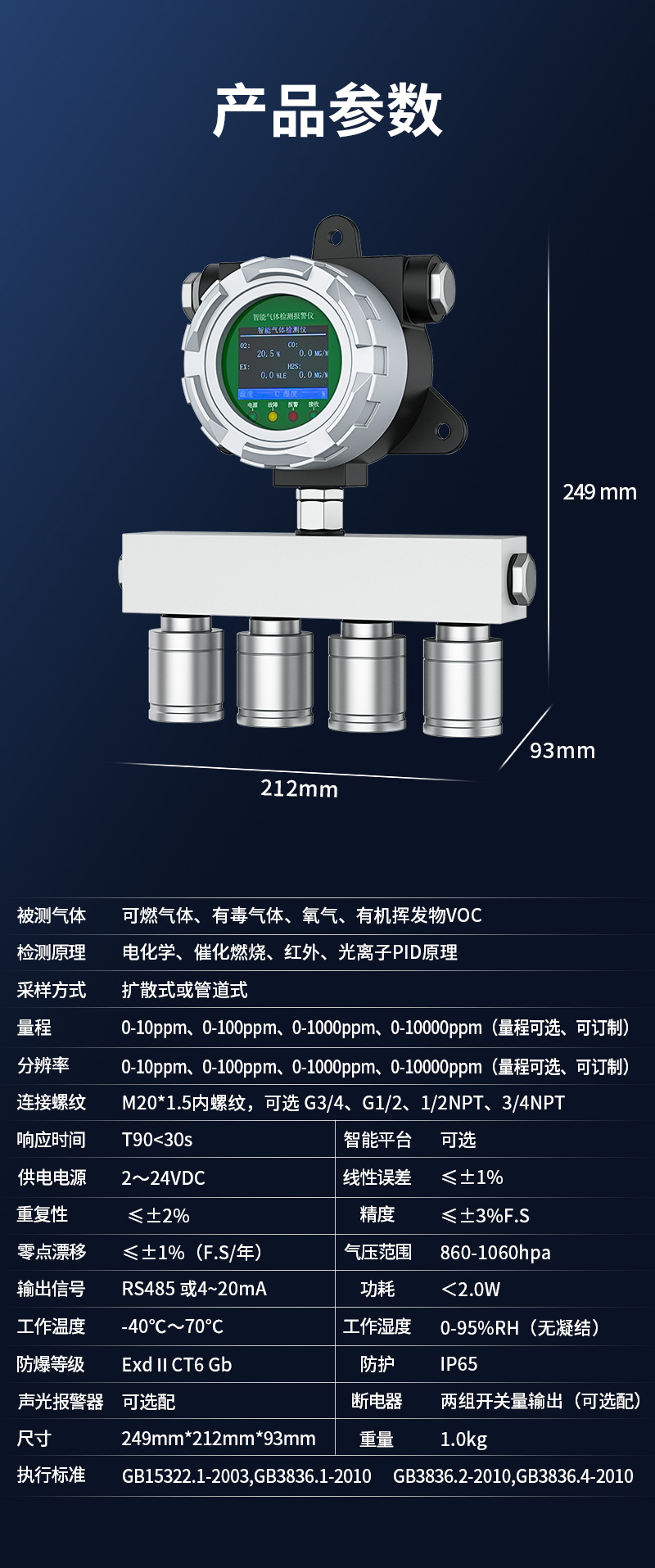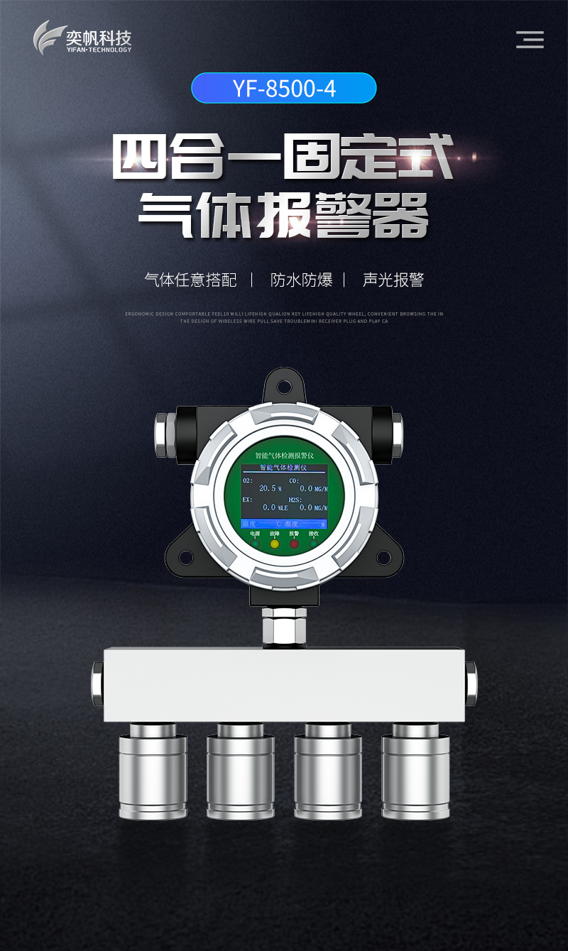 YF-8500-X4奕帆科技YF-8500-X4防爆型四合一气体检测仪,可同时检测四种气体。适用于石油化工等存在易燃易爆或有毒气体的场所,可实时准确检测气体浓度。采用进口高精度传感器和微控制器技术,响应速度快,测量精度高,稳定性和重复性好等优点。防爆接线方式活用于各种危险场所,并兼容各种控制报警器,PLC,DCS等控制系统,可以同时实现现场报警预警,4-20mA标准信号输出,继由器开关量输出,易示各项技术指标和显示浓度值,同时具有多种极的电路保护功能,有效防止各种人为因素,不可控因素导致的仪器损坏。