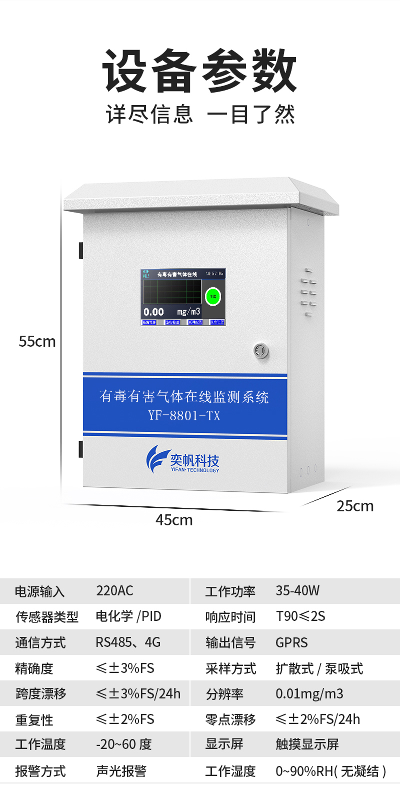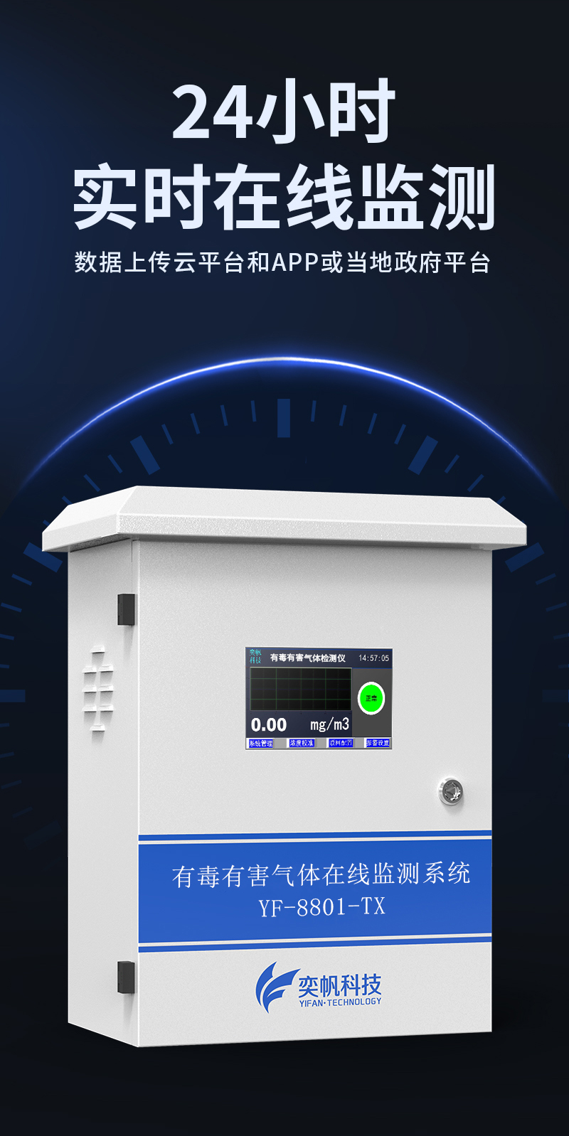 有毒有害在线监测系统是我司生产的第三代新型工业气体监测,可以在线监测多种无机因子气体(例如氨气、氟化氢、氯化氢、硫化氢、一氧化碳等),具有较高的测量精度和较宽的动态范围。支持多种检测原理(电化学、PID等)的气体探测器,采用数字式气体探测器,具有对气体探测器自动识别的能力,可灵活变更检测因子;具有整机温度自动调节和样气湿度自动调节功能,保障了气体探测器灵敏度和稳定性。可在app和云平台查看实时数据、历史数据、导出数据等,同时具备24小时连续监测、超标报警、数据存储功能