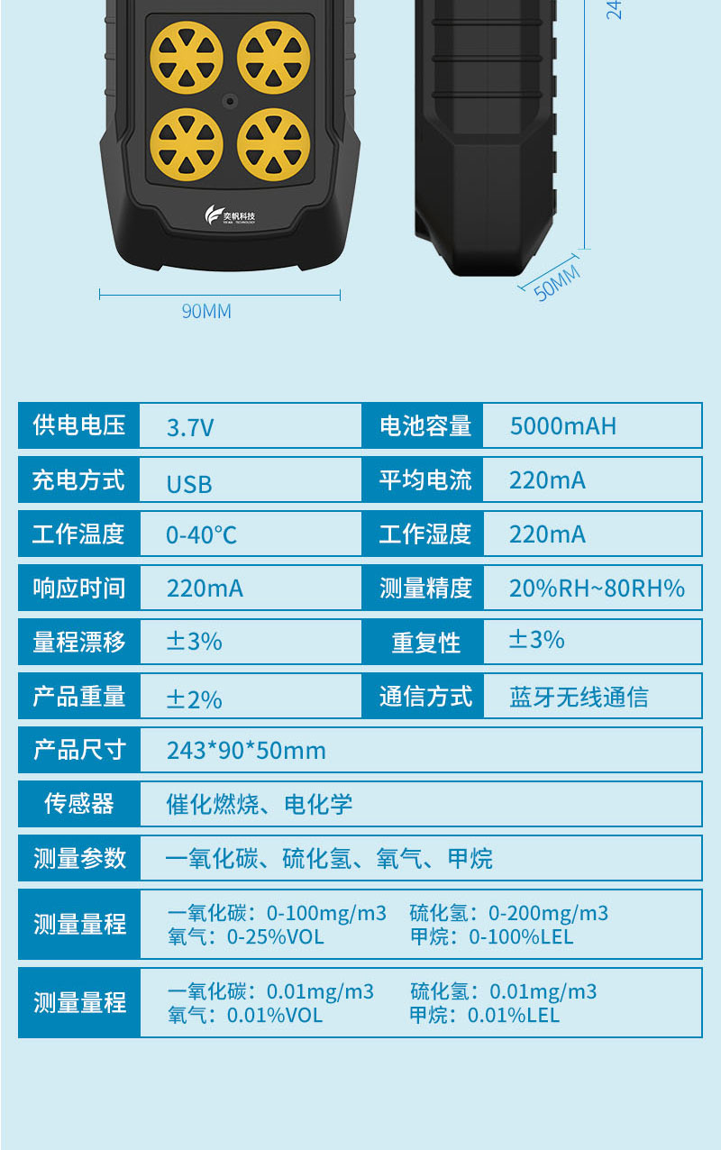 该设备采用高精度传感器,响应速度快,测量精度高,稳定性强重复性好,可连续测量环境空气中的VOC、可燃气体有毒有害气体等气体。产品采用扩散式测量,内置滤网,防止大型颗粒物影响传感器和仪器。配置1.9寸液晶点阵屏幕显示实时浓度,电量。大容量存储历史数据,可存储十万条历史记录,1万条报警记录,支持本机查看。内置2000mAH大容量锂电池,可连续工作10小时以上。