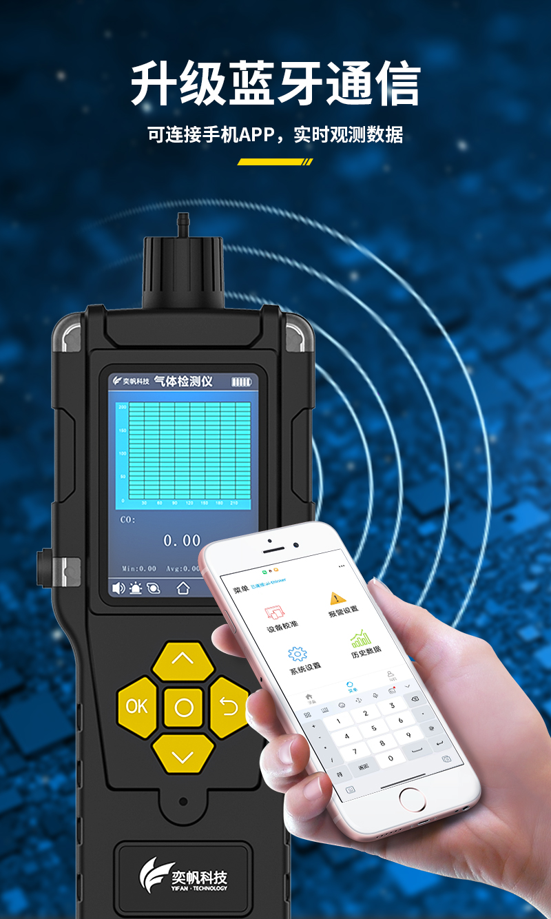 YF-2000奕帆科技YF-2000泵吸手持气体检测仪是一款数字化多功能气体检测仪,适用于测量各类气体浓度。它具有实时数据监测和气体温湿度监测,一段时间内的最大值、最小值、平均值数据,能存储一百万条历史数据,可以连接蓝牙打印机,支持屏幕截图,连接电脑导出图片,提示下次校准倒计时功能等功能。