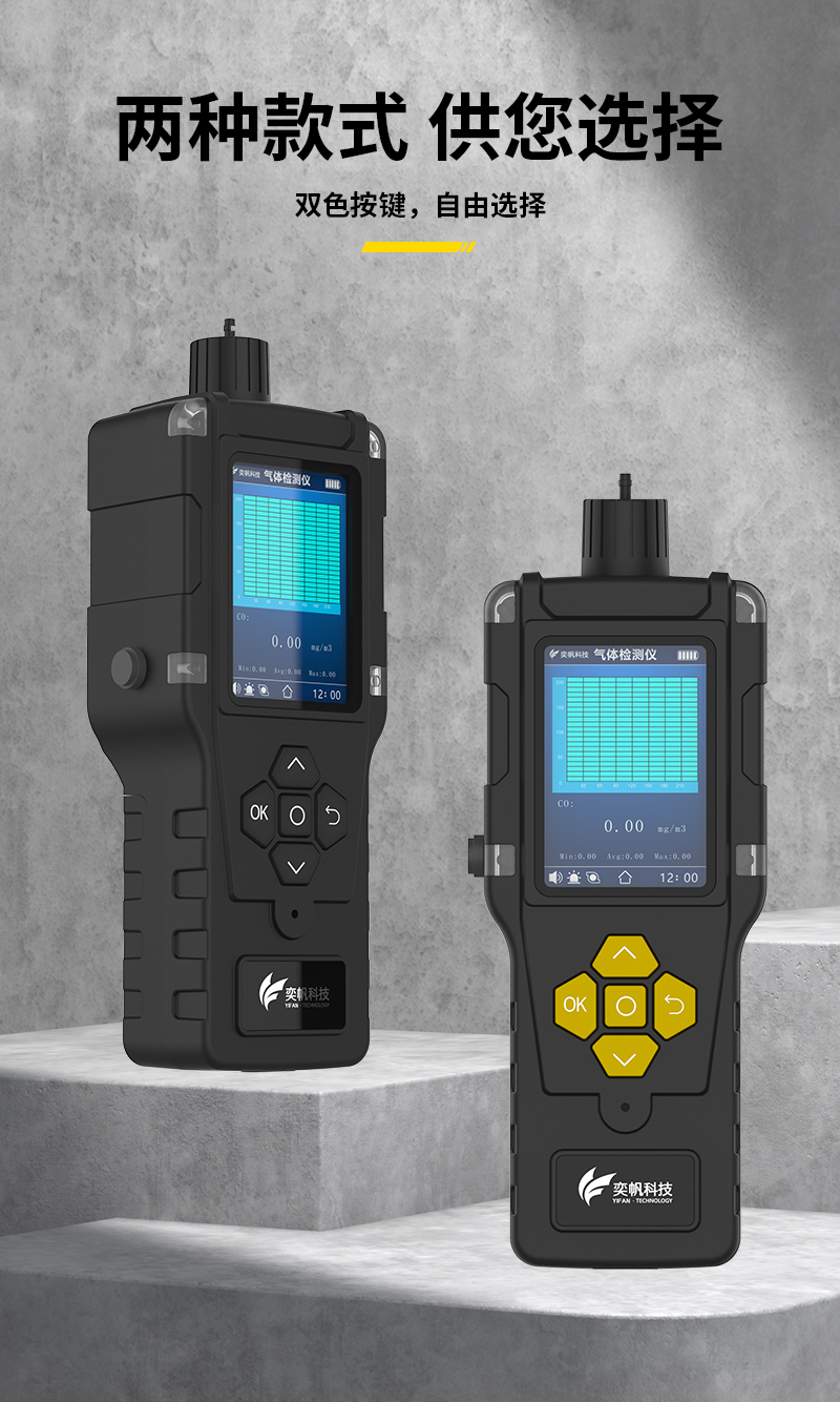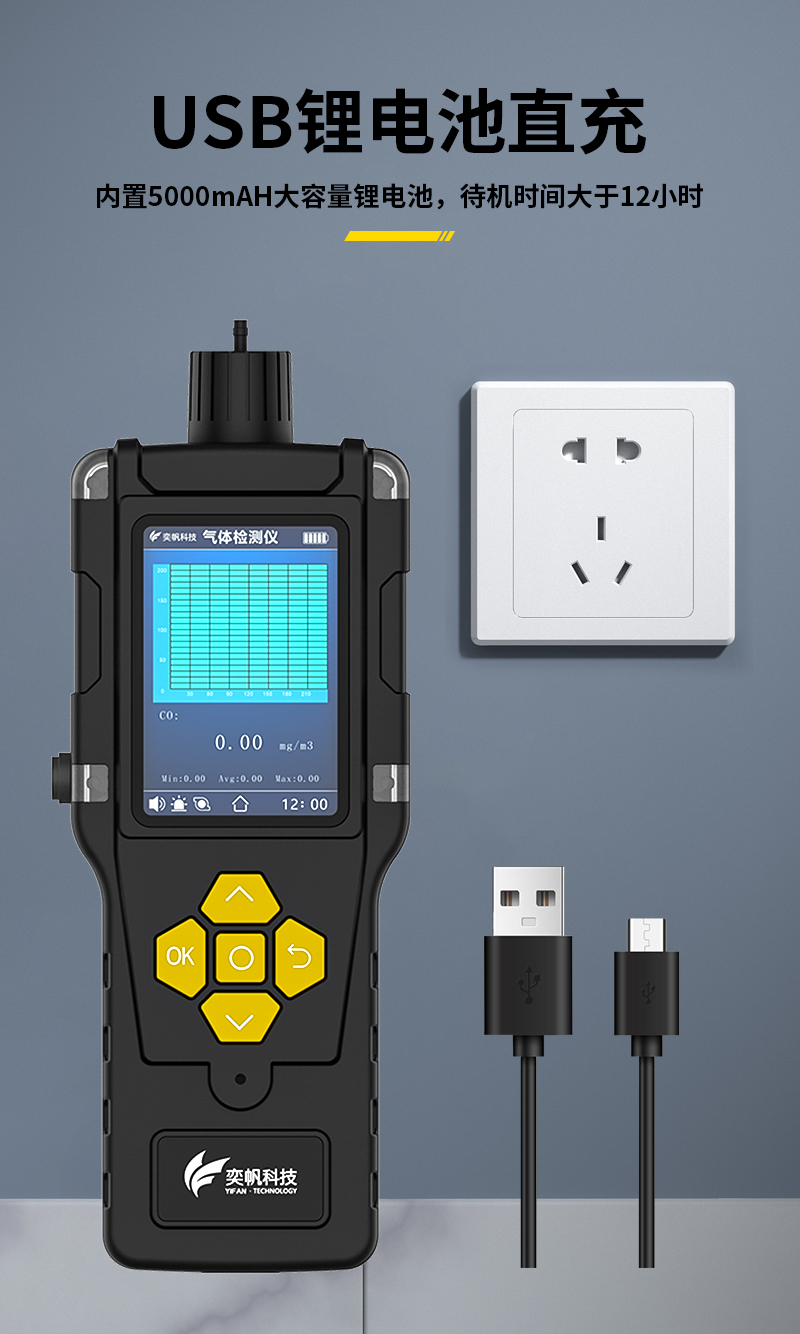 采用泵吸式测量,具备防水,防尘,防震,抗静电,抗电磁干扰,内置水汽、粉尘过滤器,防止因水汽和粉尘损坏传感器和仪器。配置3.5寸高清液晶彩屏实时显示、5000mAH大容量电池超长待机、声光振报警功能。(两种款式可选)