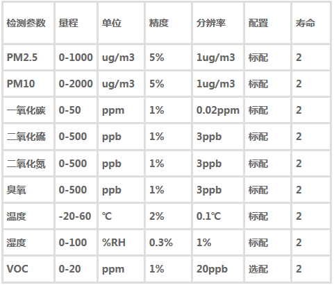 检测参数:PM2.5 、PM10、CO、 SO2、O3、NO2、温度、湿度